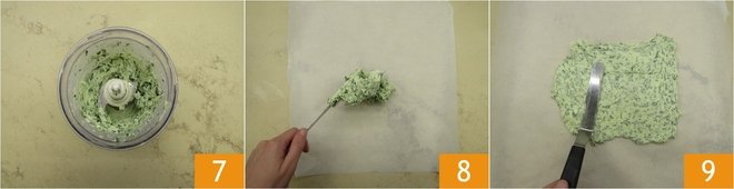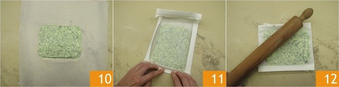 Try to obtain a regular shape 10. Place another sheet of parchment paper on top and close the edges well around the butter 11. Flatten further with a rolling pin 12 and transfer to the refrigerator. The basil butter will solidify while you prepare the other components.