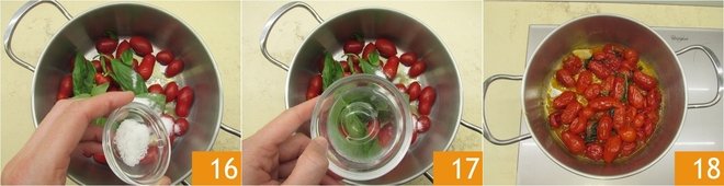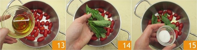 Now proceed to prepare the cherry tomato coulis. Pour the cherry tomatoes into a saucepan, add the oil 13, the basil leaves 14, and the sugar 15.