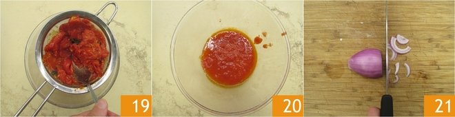 Pass everything through a sieve 19, to collect the juice in a bowl 20. The coulis is ready: set aside and prepare the eggplants. Peel the onion and slice it 21, this will be used for cooking.