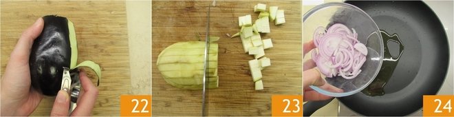 Trim the eggplants and peel them 22. Now cut them into regular cubes of about 3/8 inch 23. In a pan, pour 7 oz of oil, the onion 24, and the garlic sliced and with the core removed. Add a pinch of salt and let it soften.