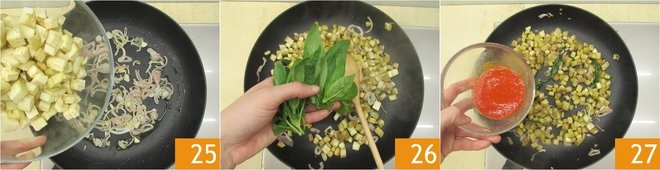 Add the eggplants 25, mix well and salt again; this way the eggplants will release water and cook more easily. Let them stew for 10 minutes over medium heat. When the eggplants begin to caramelize, add the basil 26. Cook for another 5 minutes, add about 3 oz of coulis 27, mix, and cook for another 2-3 minutes.