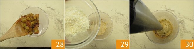 Transfer the eggplants to the bowl of an immersion blender 28. Add the breadcrumbs, Parmesan 29, salt, and pepper. Blend everything until you get a coarse, rustic cream 30.