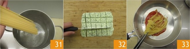 Cook the spaghetti in plenty of boiling salted water, for half the time indicated on the package 32. While the pasta cooks, take the butter from the fridge and cut it into cubes 34. Pour the remaining coulis into a large pan and transfer the spaghetti inside, taking them with tongs 33.
