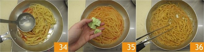 Add a little cooking water 34. Toss the spaghetti and when they are well mixed, add about 3 oz of basil butter 35. Mix well to cream 36.