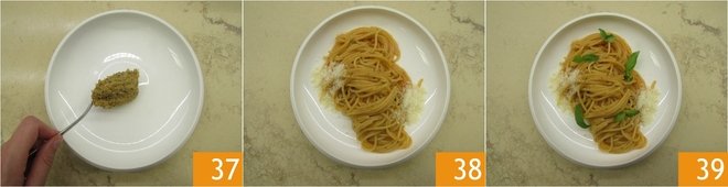 Now plate. Place the eggplant cream on the base of the plate 37 and lay the spaghetti on top. On one side put the grated Parmesan, on the other the grated Pecorino 38 and finish with some basil leaves 39. Your spaghetti parmesan with tomato coulis is ready to be served!