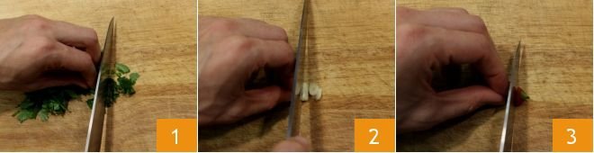 To prepare spaghetti with beans and mussels, start by preparing the mixture for the sauté. Wash and chop a sprig of parsley 1, then peel the garlic clove and chop it 2, then trim the chili pepper to remove the green part 3 and slice it finely.