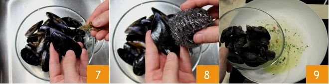 Remove the byssus, which is the beard of the mussels 7, and scrub the surface of each mussel with a scrubber 8 or scrape them with the blade of a knife. Rinse them again and add the mussels to the pan with the sauté you had prepared 9.
