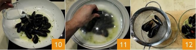 Pour in the white wine 10, let the wine evaporate for a few moments, then cover the mussels with a lid 11; it will take just a few minutes for the mussels to open. At this point, turn off the heat, strain the mussels, collecting the cooking liquid in a small bowl 12 and shell them, placing the fruits in the bowl with the liquid.
