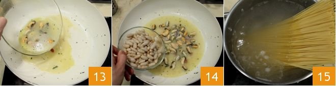 Now take the pan where you opened the mussels and pour in the fruits with the cooking liquid 13. Stir, let it cook for a few minutes, then add the cooked cannellini beans 14. Salt and pepper to taste and cook for 5-10 minutes until the beans have softened and created a soft cream. Meanwhile, in a large pot, bring the water to a boil, salt it, and cook the spaghetti 15 for 5 minutes or until al dente.