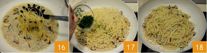 Then drain them and transfer them directly to the pan with the beans and mussels 16. Add the chopped parsley you had set aside 17, mix and sauté quickly, and serve the spaghetti with beans and mussels piping hot 18!