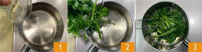 To make the spaghetti with clams, pumpkin sauce, and mandarin mustard, start by preparing the parsley oil: pour the seed oil into a small saucepan 1 and heat it to a temperature of 212°F, then add the parsley, which you have previously washed and dried 2. Blanch the parsley for a few minutes, stirring constantly 3.