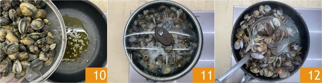 As soon as the garlic floats, add the clams 10, cover with the lid (preferably glass) 11, and cook over medium heat until they have all opened. At this point, remove the clams with a slotted spoon 12 to separate them from their cooking liquid.