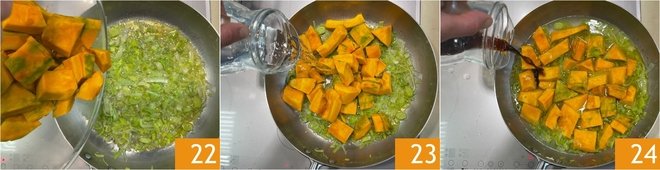 At this point, add the pumpkin 22, then pour in the water 23 and soy sauce 24. Cover with the lid and cook for 20 minutes.