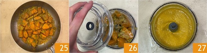 When the pumpkin is cooked, the weight of the contents of the pan should be 450 g 25. Transfer everything to a blender 26 and blend to obtain a smooth and homogeneous consistency 27. Adjust the pumpkin sauce with salt and set aside.