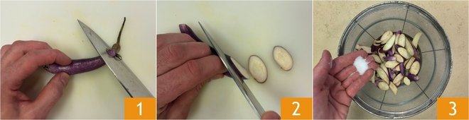 To prepare the spaghetti with eggplant, pecorino, and mussels, start with the Japanese eggplant: trim it 1 and cut into thin slices 2. Transfer the eggplant slices to a colander, salt 3 and let them drain for at least an hour.