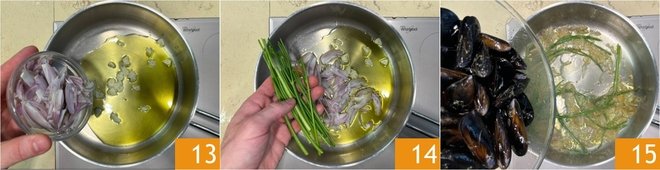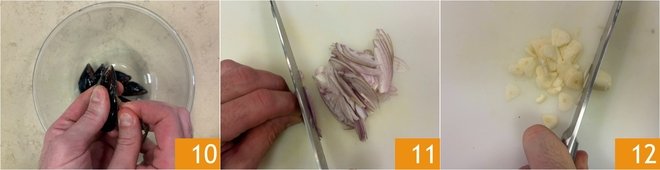 In the meantime, clean the mussels by removing the beard and impurities 10. Clean and slice the shallot 11 and the other garlic clove 12.