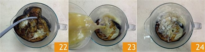 Transfer the eggplants to a jug 22, then add the mussel cooking liquid 23 along with the garlic and shallot 24.