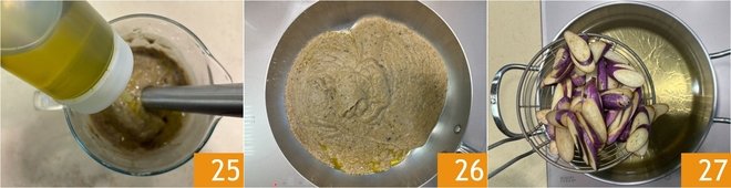 Blend with an immersion blender while pouring the oil in a thin stream 25 until you get a smooth and homogeneous cream. Put the cream back in the pan 26 and in the meantime, bring a pot of salted water to a boil. After the Japanese eggplant has drained, quickly rinse and fry in seed oil at 285°F 27.