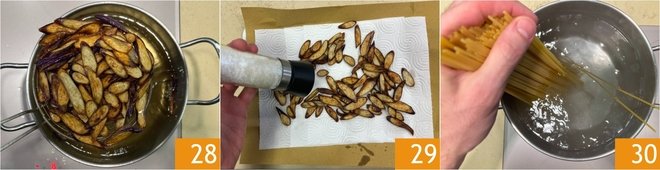 When they are golden brown, drain 28 and transfer to paper towels, then salt 29. Cook the spaghetti for a few minutes less than the time indicated on the package 30.