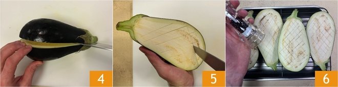 Now take the purple eggplant and the zebra eggplant, cut them in half 4 and score the flesh in a grid pattern 5. Place them in a baking dish with the cut side facing up and season with salt and pepper 6.