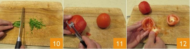 and finely chop it with a knife 10. Then peel the tomatoes 11, cut them in half, and remove the internal seeds 12.