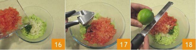 the diced tomato 16 and crush a clove of garlic 17. Then wash the lime, dry it, grate the zest 18 into the bowl with the mixture,