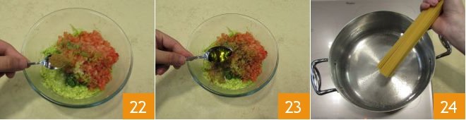 Add the cumin powder 22, add the oil 23, then also add the remaining diced avocado flesh to the mixture and mix well 23 to combine the ingredients. Then cover the guacamole with plastic wrap and let it rest in the refrigerator. Meanwhile, cook the pasta in plenty of boiling water, salted to taste 24.