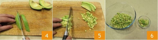 Slice the flesh 4 and then dice it 5, put it in a bowl to be mashed, and keep some diced flesh in another bowl.