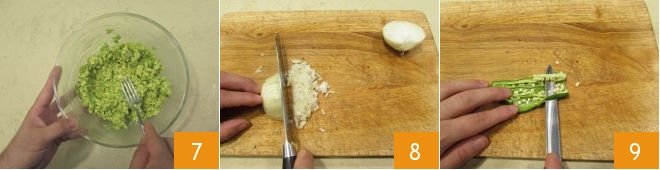 Vigorously mash the flesh with a fork or a pestle 7 until it becomes a creamy mush, then finely chop the onion 8, take the chili pepper, open it, and remove the seeds 9