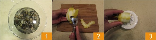 To prepare the spaghetti with lemon pesto and clams, start with the latter: let them soak in plenty of salted water for 1-2 hours 9, changing the water a couple of times to remove any sand residues 1. In the meantime, prepare the lemon pesto: use a vegetable peeler to take the zest from the lemon, being careful not to take the white part 2, then squeeze out the juice 3.