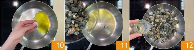 After soaking the clams, rinse them thoroughly and proceed with cooking: heat a tablespoon of olive oil in a pan with a clove of garlic 10 and fresh chili pepper. Add the clams 11 and, when the oil starts to sizzle, deglaze with white wine 12. Let the alcohol evaporate.