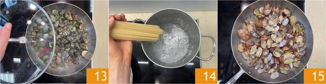 Cover with a lid 13 and let the clams open over high heat; it will take about 5 minutes. Meanwhile, cook the spaghetti al dente in plenty of salted water 14. When the clams have opened 15, turn off the heat.
