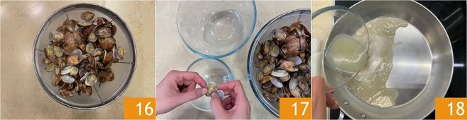 Drain them in a colander and collect their cooking water 16. Shell the clams 17, saving some whole for plating. Pour the clams' cooking water back into the same pan 18.