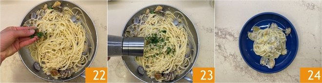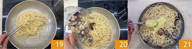 Drain the spaghetti al dente here and finish cooking them 19. Finally, add the clams 20 and the lemon pesto 21.