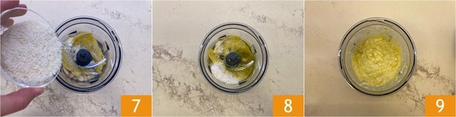 In a blender, combine the peeled almonds 4, the lemon zest 5, and the juice 6.