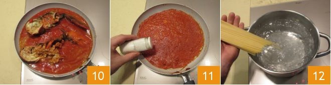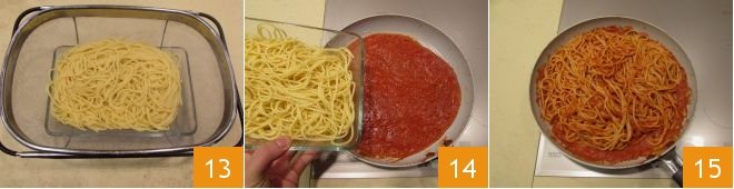 Drain the pasta 13 and add it to the sauce 14, mixing well with a spatula or a wooden spoon 15.