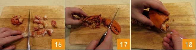 Cut the lobster meat into chunks 16, then with a knife, cut the claws 17 and retrieve the meat inside with a teaspoon 18. If you wish, you can save the shell for the final presentation.