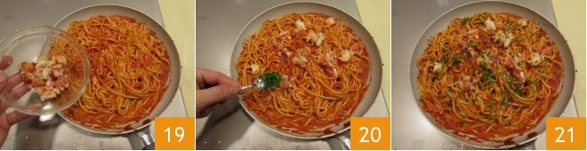 Add the meat 19, keeping a small amount aside to decorate the dish, and sauté the spaghetti with the sauce for 2 minutes. Finally, turn off the heat and add finely chopped parsley to the spaghetti 20. Once ready 21,