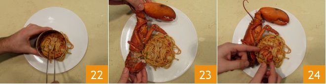 with the help of a ring mold, place the spaghetti on a serving plate 22: you can garnish with the lobster 23 and the meat you set aside: your spaghetti with lobster in bellavista is ready to be served 24!