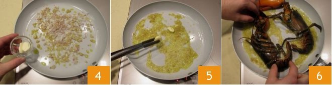 let it brown in a non-stick pan with the oil and unpeeled garlic cloves 4; when the garlic is golden, remove it with kitchen tongs 5 and place the lobsters in the pan 6, sautéing for 3-4 minutes.