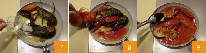 Deglaze with white wine 7 and cook over moderate heat for 2 minutes, then add the tomato puree 8, which should be quite thick. Cook for another 4-5 minutes, letting the sauce dry and occasionally turning the lobsters for even cooking 9.