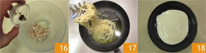While the pasta is cooking, prepare the Monte Veronese sauce: pour the grated cheese into a non-stick pan 13, add the cream 14 and mix over low heat to melt it completely. Once ready, set the Monte Veronese sauce aside 15.