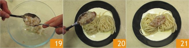 With the help of 2 spoons, form quenelles 19 and place the tartare on top of the plate 20. Your spaghetti with Monte Veronese sauce and sea bass tartare is ready to be served 21!
