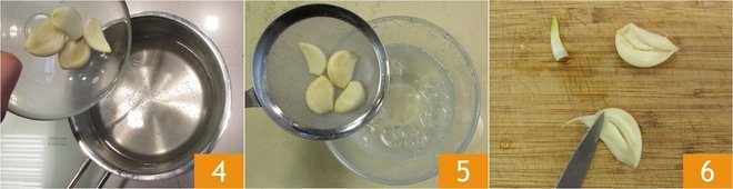 Proceed to the garlic cream: peel the garlic cloves and blanch them for a few seconds 4, then place them in a bowl with ice water 5. Repeat this operation 3 times, then remove the internal sprout 6.