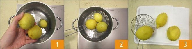 To prepare the spaghetti with roasted lemon and prawns, start with the lemon cream. Wash them well and immerse them in boiling water 1. Cook for about 25-30 minutes until they are soft. Drain them 2, keeping the water aside, and transfer them to a tray with paper towels 3. Let them cool slightly and dry them very well.