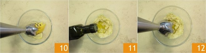 Blend with an immersion blender 10 until you obtain a cream, adding water as needed. Now add a little oil in a thin stream 11 and blend again 12.