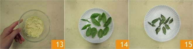 You should obtain a smooth cream 13. Wash and dry the basil well. Place it on a plate 14, without overlapping the leaves, and cook in the microwave for about 3 minutes at 700 Watts, to dehydrate them 15.