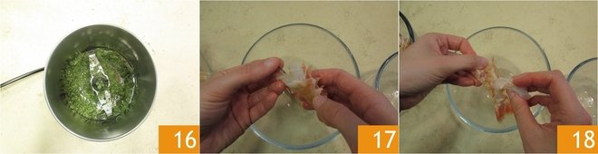 Let them cool for a few seconds, then blend them with a coffee grinder to pulverize them 16. Clean the prawns, removing the head, the inner filament 17, and the shell 18.