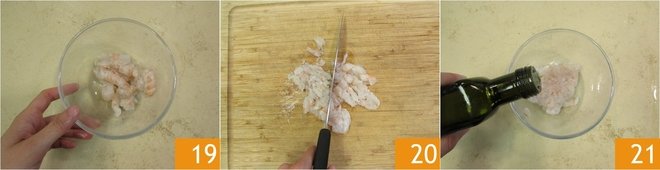 Once you have cleaned them all 19, chop them with a knife 20 to prepare the tartare. Transfer to a small bowl and season with oil 21, salt, and pepper.