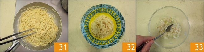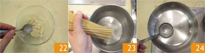 Mix well and set aside in the refrigerator 22. Cook the pasta in boiling salted water 23. Meanwhile, in a pan, pour a ladle of cooking water 24.